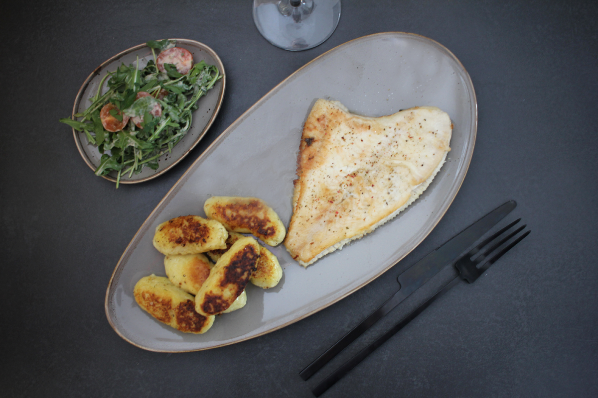 Die Kartoffeln schälen und klein schneiden. Die Kartoffeln in einen Topf mit kaltem Salzwasser geben und zum Kochen bringen. Ca. 20 Minuten kochen lassen. Danach das Wasser abgießen, die Kartoffeln stampfen und mit Salz und Pfeffer würzen. Zu Gnocchi formen und in kochendem Salzwasser garen, bis sie an der Oberfläche schwimmen. Danach die Gnocchi in einer Pfanne mit etwas Öl anbraten. Die Schollenfilets kalt waschen, abtupfen, mit dem Saft der Zitrone beträufeln und mit Salz und Pfeffer würzen. Ein paar Minuten ziehen lassen und dann mit etwas Öl und der Butter auf der Hautseite ca. 4 Minuten braten, danach wenden, die Pfanne von der Platte nehmen und die Filets für 2 Minuten in der Resthitze ziehen lassen. Zusammen mit den Gnocchi anrichten, dazu passt ein frischer Salat aus Rucola und Tomaten.