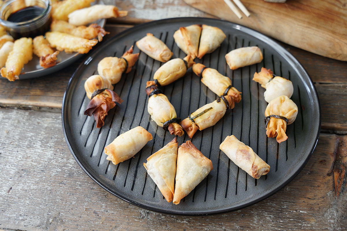 - 4 Stück. Filo Oriental (ca. 40 g): 50 % Garnelen, Wasser (80 % Garnelen, E452)), Kürbis, Kartoffelstärke, Weizenmehl, raffiniertes Sojaöl, Karotte, Salz, Zucker, Chili, schwarzer Pfeffer, Austernsauce (WEICHTIERE).