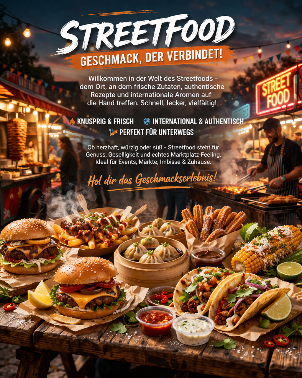 Entdecken Sie die Welt des Streetfoods und bringen Sie internationale Spezialitäten direkt zu sich. Streetfood steht für Genuss, Geselligkeit und Vielfalt – perfekt für alle, die gutes Essen lieben.